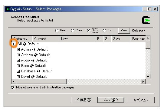 Selecting Packages の画面では、図の橙の部分をクリックすると、下の画面 のように変って、「全てを選ぶ」ことも可能です。